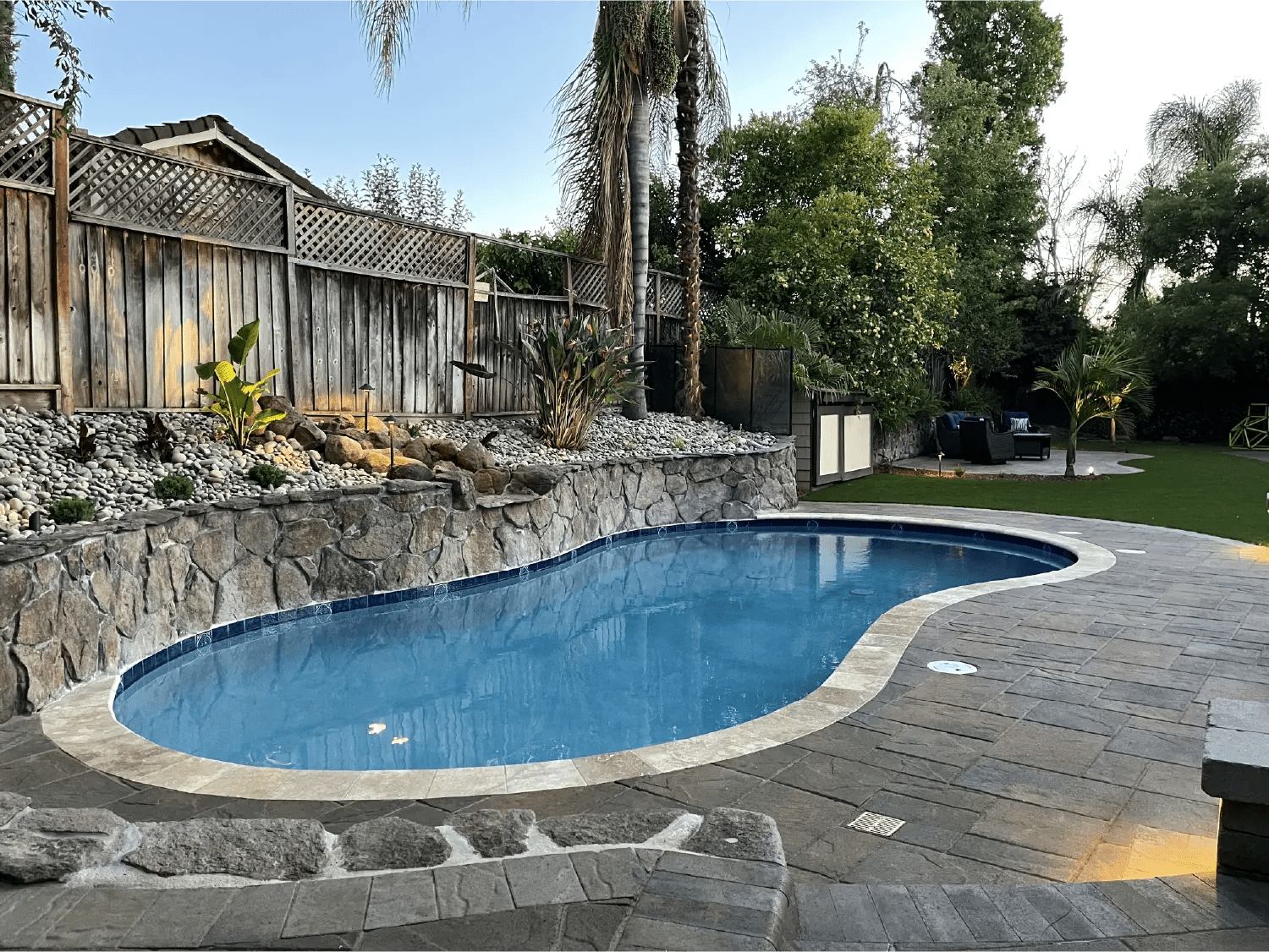 Watch as we transform this backyard into a breathtaking oasis. Though every project has its hurdles, we believe that greatness can be achieved with perseverance. That’s why Evergreen Construction & Landscaping leaves no stone unturned in their pursuit of excellence. Our pavers seamlessly unite the patio to the pool deck, proving beauty and practicality can coexist. The Belgard seat wall and fire pit are perfect spots for cozying up with loved ones. To take your backyard to the next level, we added a personalized landscape lighting design that created a family-friendly retreat that caters to all your needs with us by your side.